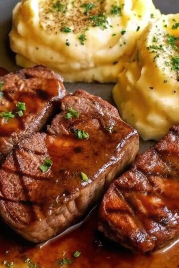 Deliciosos Bocados de Filete con Mantequilla de Ajo y Puré